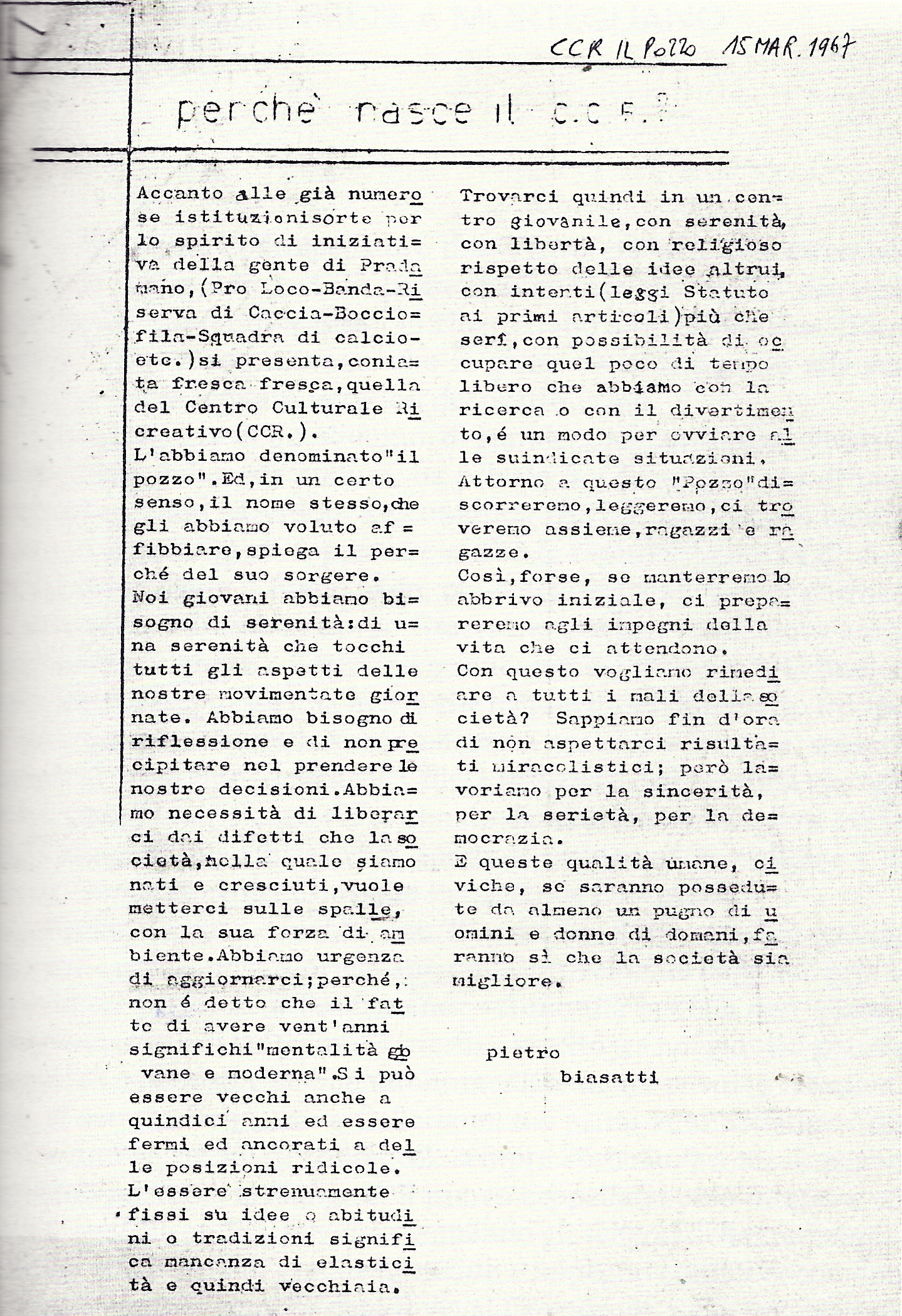 Nella dolorosa circostanza della prematura sua scomparsa, tanti di coloro che qui assieme a lui hanno contribuito alla fondazione del Circolo Culturale Ricreativo “IL POZZO” sentono il bisogno di esternare la loro gratitudine nei suoi confronti e di rivivere con commozione quegli anni di fermento giovanile ed ecclesiale che li ha visti perennemente occupare i gradini della canonica e talvolta anche le sue retrovie dove la mamma stentava a proteggere il sonno e la riservatezza del suo amato Pierino.